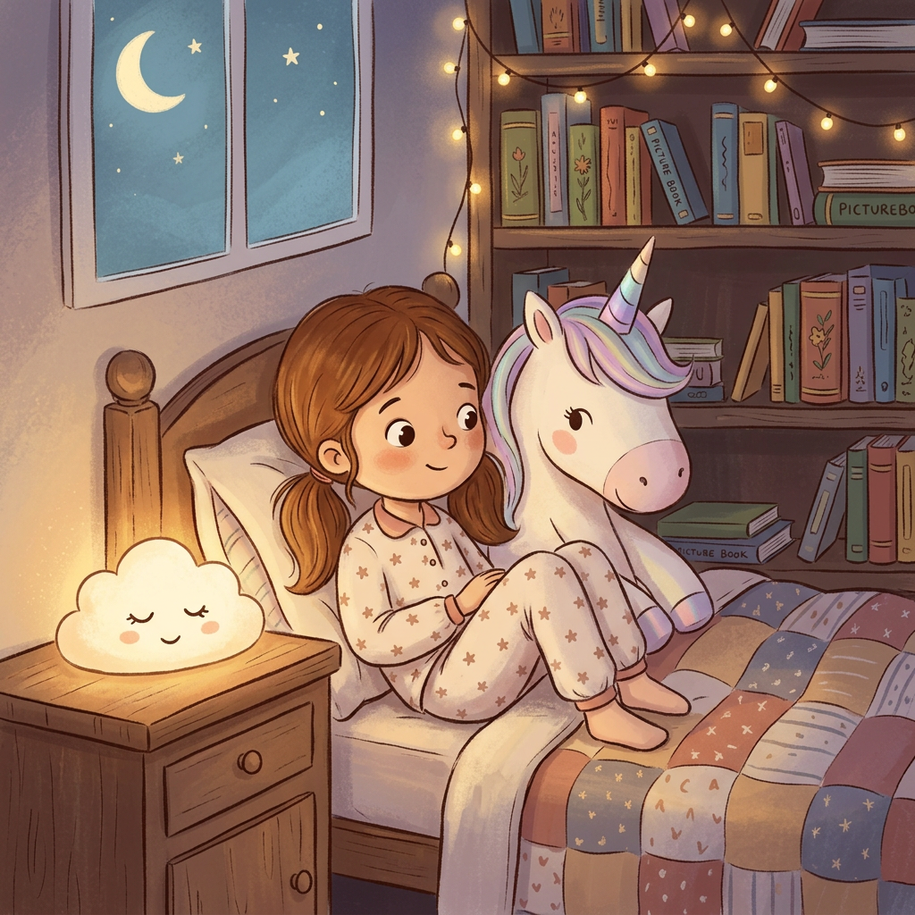 Generate a bedtime story featuring your child's unicorn plush and night light using real photo inputs for extra emotional connection.