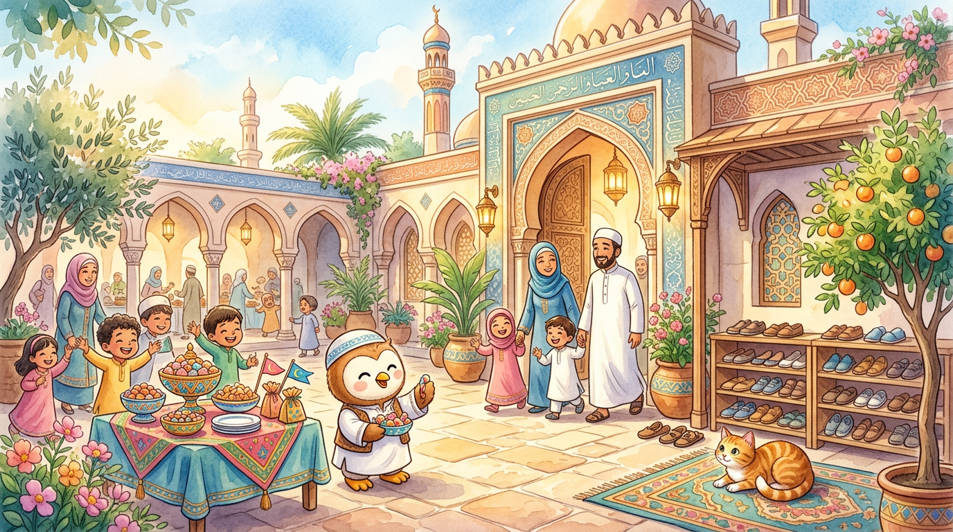 A heartwarming community story where your child's toy helps get the masjid ready for a special gathering full of smiles, soft chatter, and tasty treats. While hurrying to welcome guests and care for a friendly masjid cat, the little hero discovers that the best part of any party is sharing, helping, and making every person feel at home.